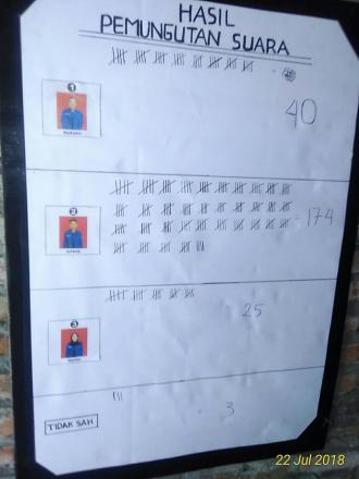 Setelah waktu pencoblosan selesai, para panitia langsung melakukan penghitungan suara. Hasil Pemilu menentukan bahwa Calon Ketua Pemuda bernama Edwin menang mutlak dengan hasil suara sebanyak 174. Dengan demikian, Saudara Edwin akan mengemban amanah sebagai Ketua Pemuda Periode berikutnya.